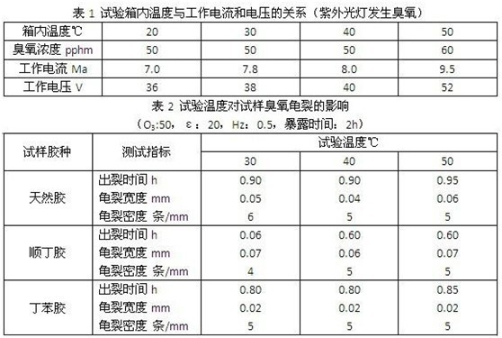 臭氧老化試驗(yàn)箱試驗(yàn)溫度的選擇通常是根據(jù)硫化橡膠使用環(huán)境的最高氣溫和試驗(yàn)設(shè)備的控溫條件等因素來確定的,另一方面還要考慮到臭氧容易受熱的作用而分解,所以臭氧老化試驗(yàn)的溫度不能過低,也不宜過高,GB/T13642-1992標(biāo)準(zhǔn)規(guī)定優(yōu)先選用的試驗(yàn)溫度為40±2℃。根據(jù)我國各地的氣候情況,最高氣溫通常達(dá)到37~44℃。在南方的夏天,氣溫經(jīng)常在30℃以上,要做30℃以下的試驗(yàn)是不可能的。但試驗(yàn)溫度也不應(yīng)超過60℃,否則,熱氧老化將逐漸起主導(dǎo)作用,而且會加速臭氧的分解,影響試驗(yàn)結(jié)果。表1示出臭氧老化試驗(yàn)箱內(nèi)溫度與發(fā)生臭氧的紫外光燈所需的電流和電壓的關(guān)系,可見,當(dāng)溫度達(dá)到50℃時,臭氧開始分解,所需的工作電流和電壓都要相應(yīng)提高較多,才能保持所需的臭氧濃度。表2為試驗(yàn)溫度對硫化橡膠試樣臭氧龜裂影響到的試驗(yàn)結(jié)果?煽闯鰷囟葘Τ粞觚斄殉潭扔绊懖幻黠@,但對龜裂出現(xiàn)時間則有些小差別,如溫度50℃時試樣出裂時間則延遲了一些,說明不同溫度試驗(yàn)的結(jié)果是不能作比較的。因此,采用40±2℃為試驗(yàn)溫度是比較適宜的。但GB/T13642-1992標(biāo)準(zhǔn)還推薦了可選用的其它試驗(yàn)溫度,如30±2℃或23±2℃,可供低溫度地區(qū)采用。